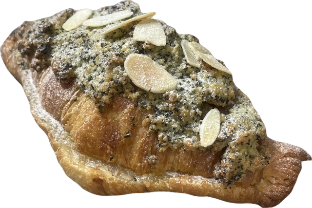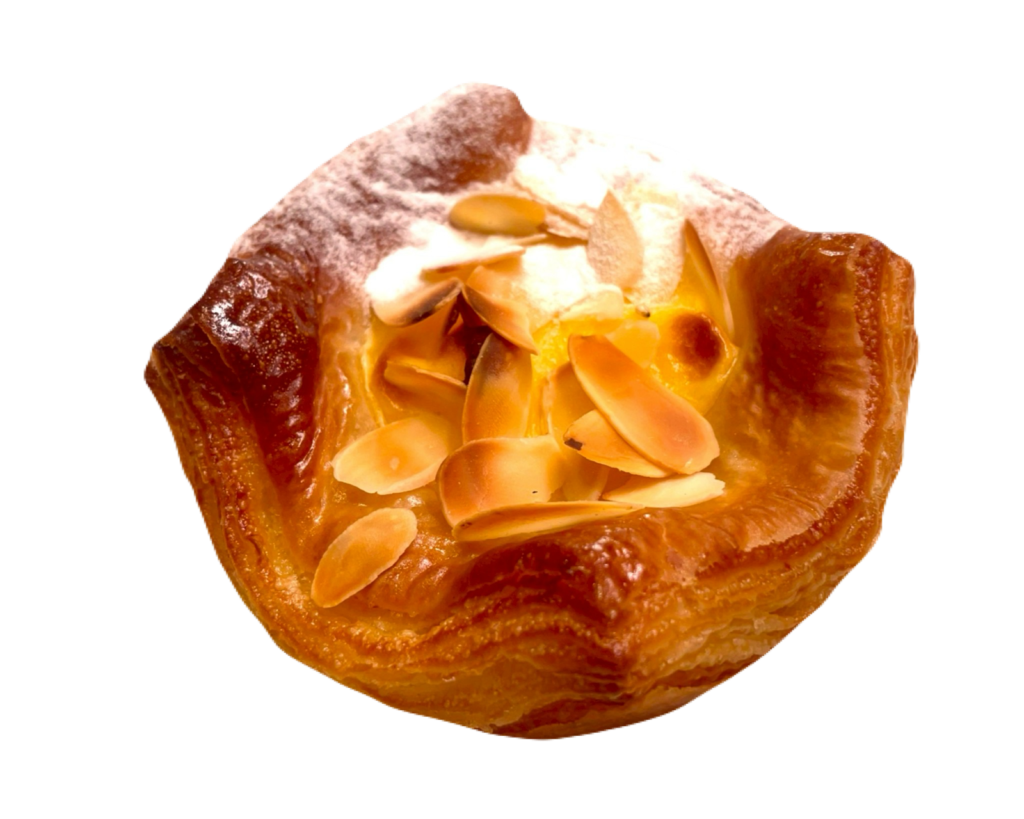 自家製デニッシュにとろけるカスタードとアーモンドをトッピングして焼き上げた王道のスイーツ。