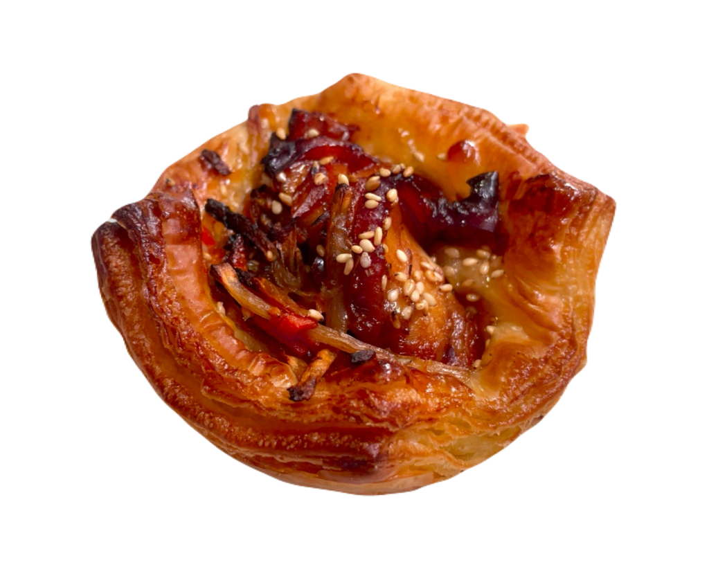 サクサクデニッシュ生地に甘辛照焼チキンときんぴらをのせて焼き上げた、香ばしさ際立つ和風デニッシュ。